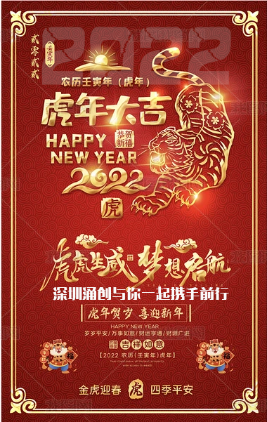 首先感謝大家在牛年給予我公司的鼎力支持。在2022年春節即將來臨之際,深圳市涌創興盛科技有限公司全體員工恭祝大家新春愉快,合家歡樂,萬事如意,虎年吉祥、虎慮生威!