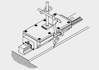 使用兩個滑塊緊密接合固定于測定用平板,依床臺導軌裝配附近的基準面為準,使用千分量表校準基準側導軌之側邊基準面,從導軌的一端開始校準并依序以特定的扭力鎖緊裝配螺絲。