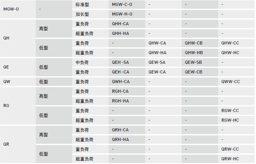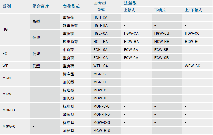 為服務客戶因應其對產品多樣性的需求,除了適用一般工具機產業的HG系列外,更研究開發出較適合自動化產業的EG系列以及適合于單軸設備使用的WE/QW系列;且研究開發出適合高剛性需求產業的RG/QR系列及微小型機械半導體產業適用之MGN/MGW系列;并針對高科技產業研究開發出具有高速、寧靜、低發塵需求的QH/QE系列產品。