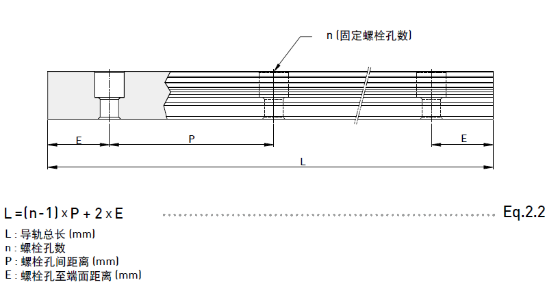 HIWIN 備有導軌標準長度庫存供應客戶需求。若客戶訂購非標準長度導軌時,端面距離E的尺寸最好不要大于1/2P,防止因E的尺寸過大導致導軌裝配后端部的不穩定,而降低直線導軌的精度。